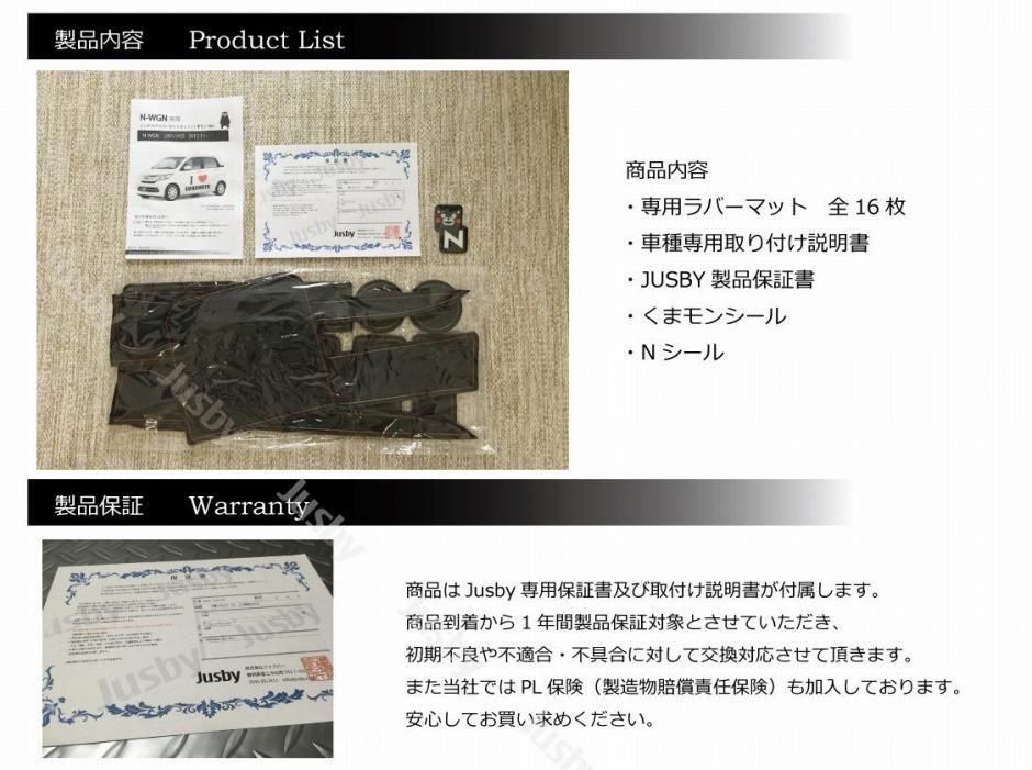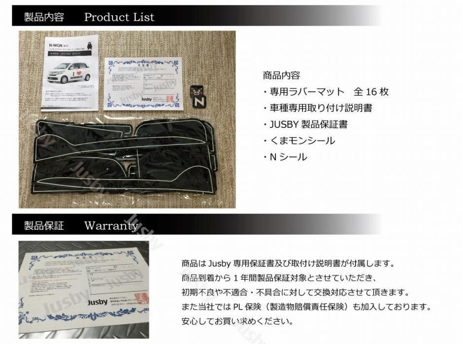 Jusby専用の製品保証書と車種専用取り付け説明書が必ず付属いたします。