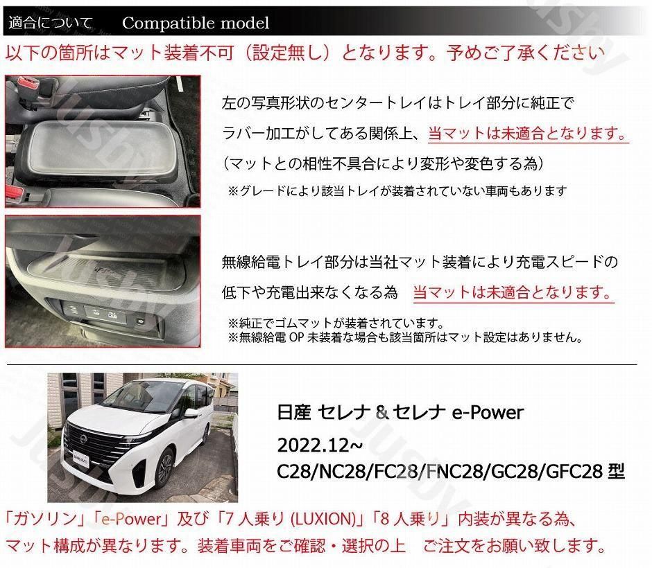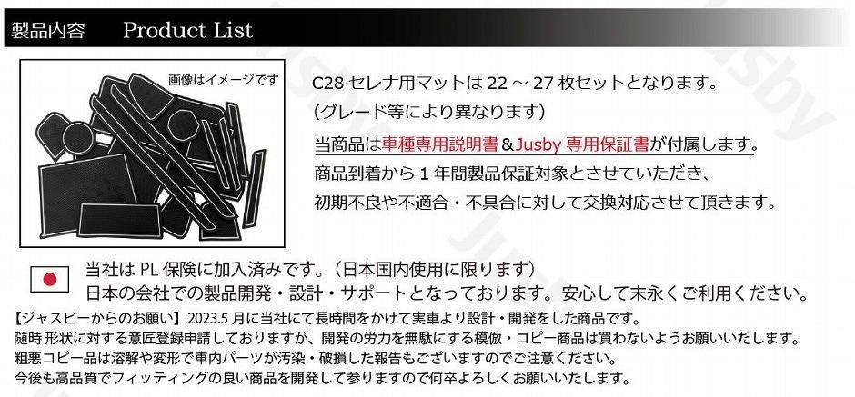 全22〜27枚セットで、セレナ に適合致します。C28セレナになりより一層車内が静かな事もあり小物が動いた際などパネルと干渉・異音等が発生しやすい為是非当マットで保護&ドレスアップをお勧めいたします。【注意】一部未適合なポケットも有ります。画像の適合をご確認ください。